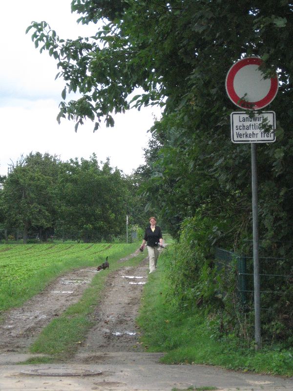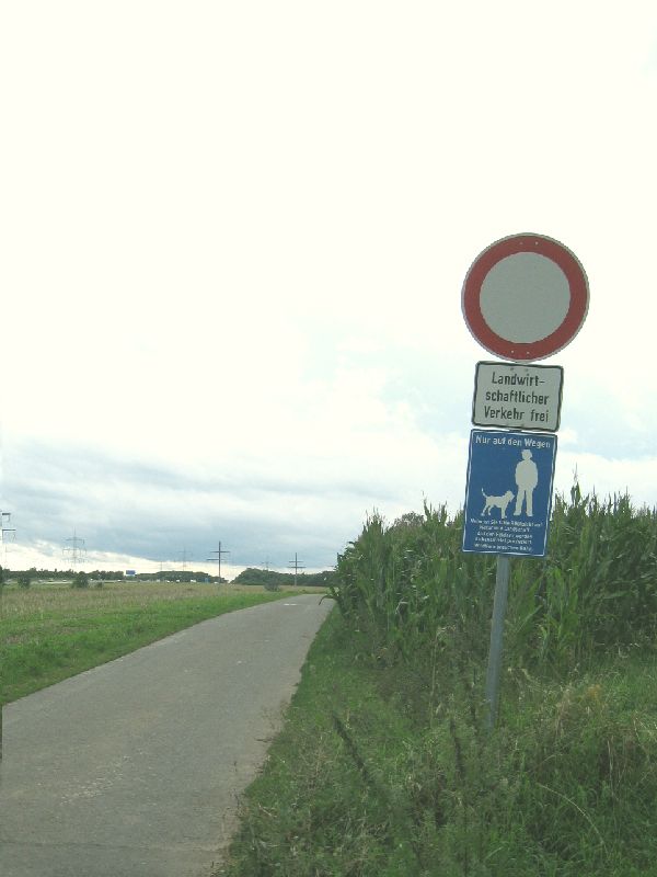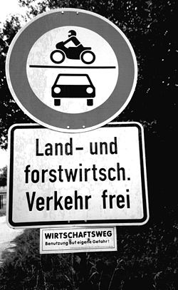 Allerdings gibt es die Auffassung, dass ein Wegweiser, der den Eindruck erweckt, er unterstütze ein vom Grundstücks– bzw. Wegeeigentümer gewährtes Betretungsrecht, das Verkehrsverbot insoweit aufhebt, als das Radfahren dann als »Nicht–Verkehr« sondern als nicht stvo–geregeltes »Betreten« verkehrsrechtlich zumindest als geduldet anzusehen sei (vgl. auch OLG Frankfurt 24 U 21 ⁄ 99 siehe auch Abb.2). Diese jedoch für jene, die zunächst keinen Unterschied zwischen Verkehr iSd StVO und Betreten im Sinne des Betretungsrechtes erkennen werden, nur mittelbar begreifbare Situation verwirrt nicht nur dem Grunde nach, sondern wird dann auch anwendungpraktisch gefährlich, wenn z.B. Kinder dadurch nicht begreifen, dass das Zeichen 250 an anderer Stelle nicht nur einen Wirtschaftsweg (stvo–) verkehrsfrei halten soll, sondern eine tatsächlich riskante Straßen– oder Wegepassage.